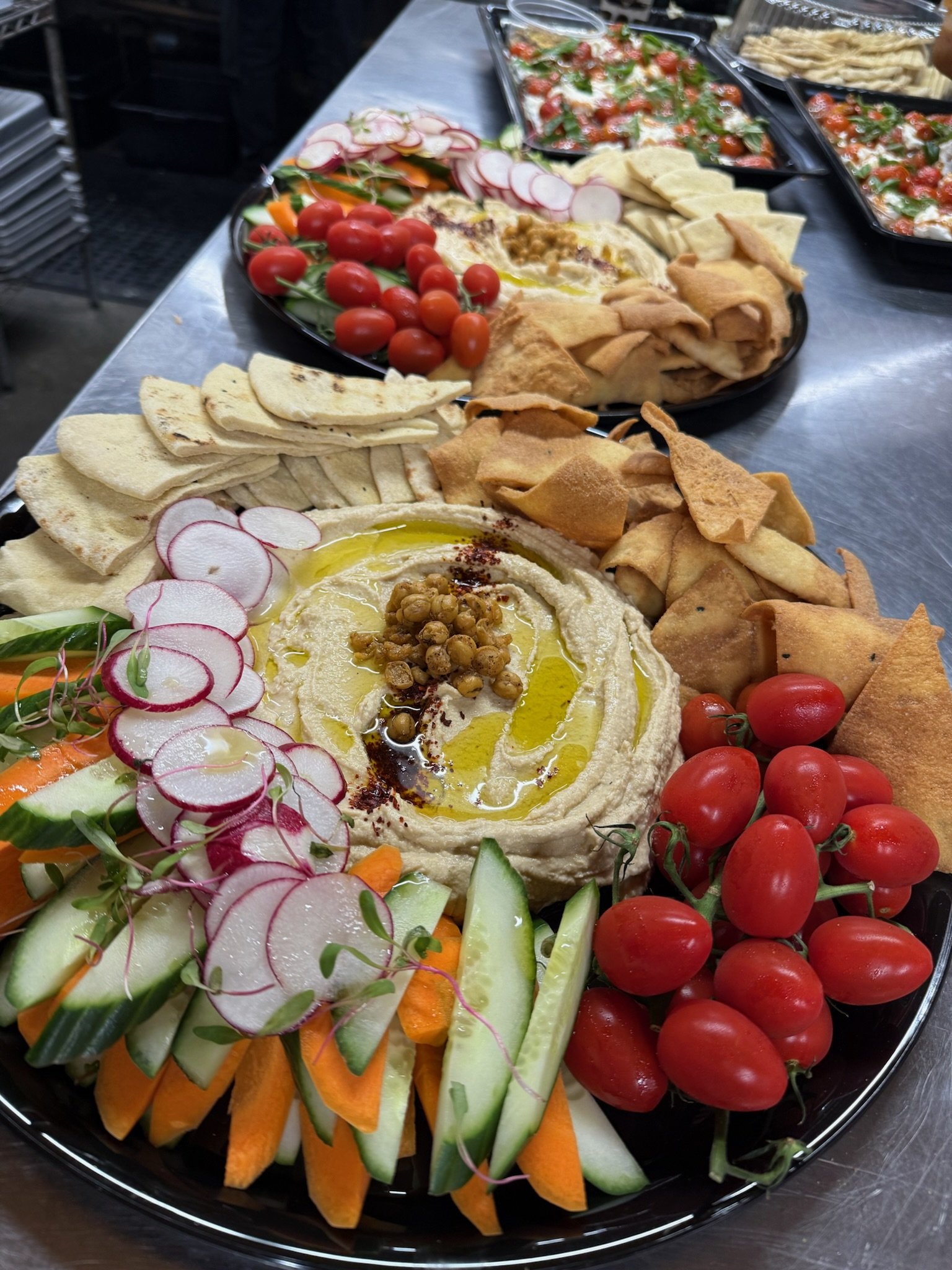 Middle Eastern Dip Platter | hummus, muhammara, baba ganoush with pita, chips and crudité